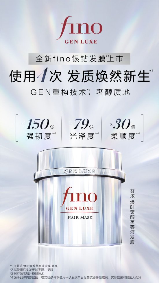 以护肤理念奢养秀发,fino芬浓“银钻发膜”助力在每一次的细腻呵护中,告别干枯毛躁,重现强韧光泽。