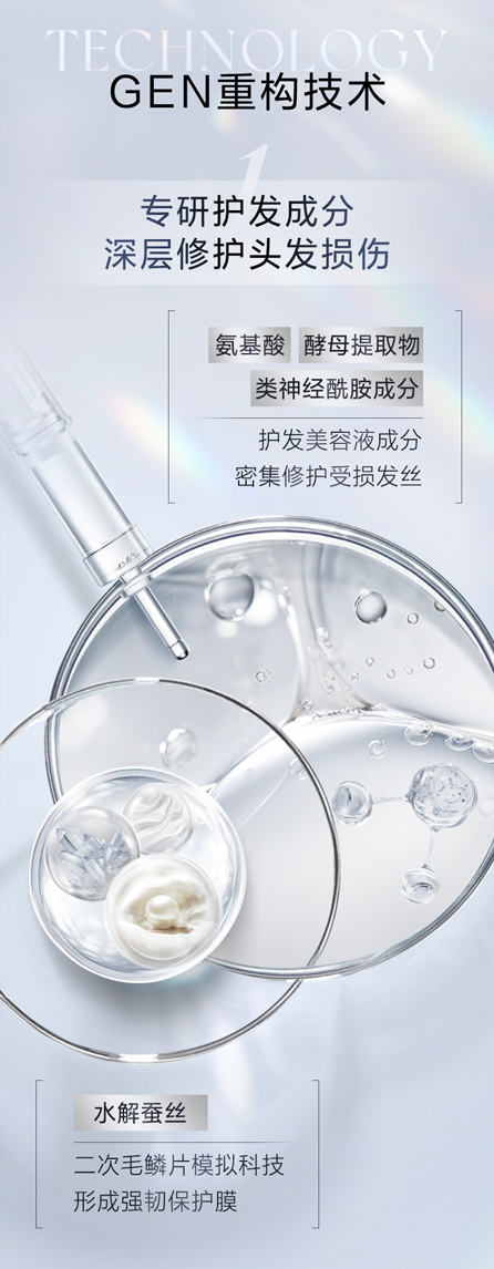 研究发现,秀发天生丽质的人,与生俱来便拥有一层更厚、更强韧的秀发“保护膜”,可以保护头发免受损伤。然而不论是强烈日晒、空气质量等生活环境影响,或是长期染烫导致的发质受损,都会让秀发失去原本的保护层,变得干枯毛躁、脆弱易断。历经数次实验革新,fino芬浓首创GEN重构技术——二次毛鳞片模拟科技,能够通过模拟生成强韧的发丝保护膜,使秀发更加强韧有光泽。