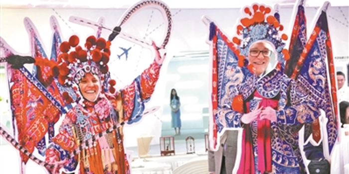 广州旅游推介会举行,嘉宾与粤剧展板拍照留念