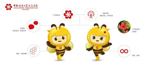 广交会吉祥物是一对活泼可爱、勤劳勇敢的蜜蜂,分别命名为“好宝 Bee”和“好妮 Honey”。