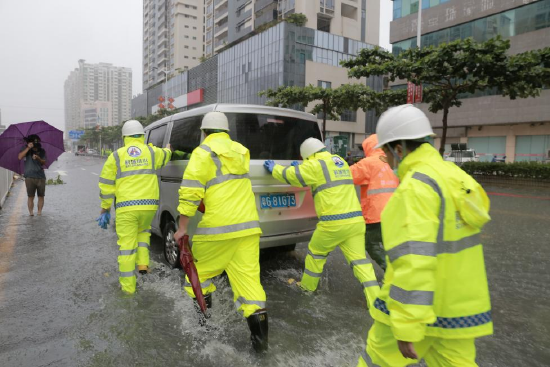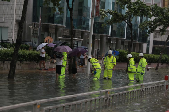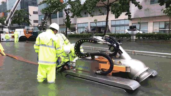 众志成城,齐心协力同抗涝。在广州支援队伍连夜驱车8个多小时到达湛江市后,随即马不停蹄投入紧张的排涝工作。在市区积水情况较为严重的霞山绿村路昌大昌段、海滨大道和平大厦段、开发区绿华路段,广州支援队伍会同市城综局排水应急抢险小组部署了 4 辆强排应急抽水泵车进行抽排路面积水。抢险队伍顶着风冒着强降雨,在路面交通拥堵、地下排水管线堵塞等诸多不利因素下,开展抢险救援工作,携手斗风雨。经过连续 8小时奋战,截至下午 16 时,上述路段积水水位大幅下降,交通逐步恢复正常。在完成紧急强排作业后,广州排水公司的支援队伍又继续赶往其他地方开展支援作业,用无私的奉献与兄弟城市携手筑起城市正常运行的安全防线,迎难而上,不畏艰险的精神感动了人民群众。