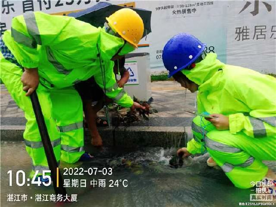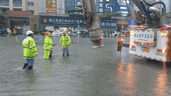 各部门合力排查险情。湛江市城综局各部门迅速响应,分管领导前往一线靠前指挥,霞山、赤坎、麻章、坡头、经开区5个片区9个工作小组迅速部署防汛排涝工作,18支排水应急抢险小组火速集结,第一时间开展市政道路巡查和定点值守工作,全面紧急抢修,有序做好防涝各项组织工作,最大限度的保障城市安全。同时,在市委市政府的统筹部署下,在市应急管理局调度下,广州排水公司派出 4支应急抢险队伍30余名抢险队员,调遣4台大功率多功能强排车,紧急驰援湛江市城市排涝工作。4支应对队伍作为机动队伍,统一调配,应对突发情况。