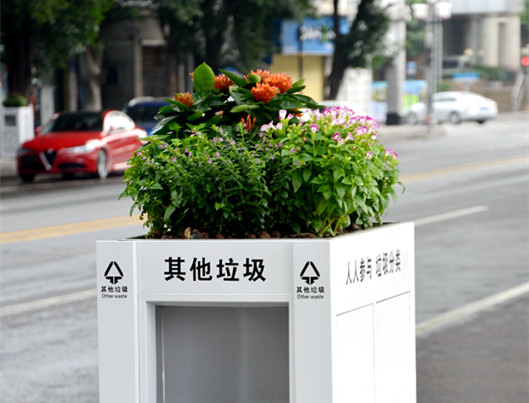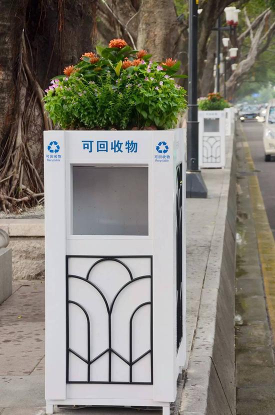 值得一提的是,该款垃圾桶顶部全部设计成盆栽,首批投放的垃圾桶顶部栽种了满天星等三种植物,之后每隔1至2个月进行定期更换。