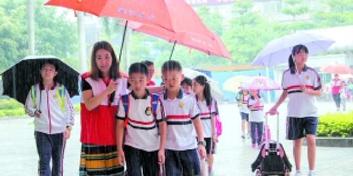 广州日报讯 (全媒体记者汪万里摄影报道)无论刮风下雨,每天清晨,南城阳光三小门口都有一群身穿红十字志愿者服的学生家长站在路边上,他们有的示意车辆慢行,有的牵领学生过斑马线,1400多名学生在这些家长志愿者的保护下安全有序进入校园。