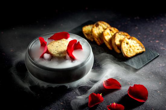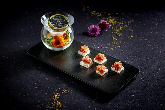 除此之外,来自轻法式海鲜西餐厅Catch的主厨Jeffrey也带来以“花”为灵感,而为酒单特别设计搭配的风味小食,例如鲜花金枪鱼塔塔,创造性地以春季鲜嫩欲滴的玫瑰花入料,搭配法式烹饪手法制作而成。口感细滑,带有馥郁的玫瑰香气,清新的花香能从一定程度上中和鸭肉与黄油带来的油腻感。其他特色美食还有法式鸭肉酱配玫瑰花黄油、西班牙5J火腿和龙虾菊花玉米饼等。