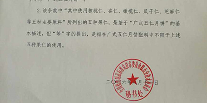 对此,全国焙烤制品标准化技术委员会糕点分技术委员会在函件中解释称,“等”字的提出,是指在广式五仁月饼配料中不限于上述五种果仁的使用。