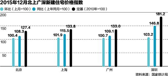 这就是广深这两个一线城市这两年楼市的差别写照。就在特区深圳2015年来房价狂飙的同时,100多公里外的省城广州却波澜不惊。虽然2015年12月广州房价同比上涨了9.2%,但考虑到2014年下半年后广州房价下跌较多的基数影响,基本上目前广州房价仍没有超2013年底2014年上半年的高峰期水平。