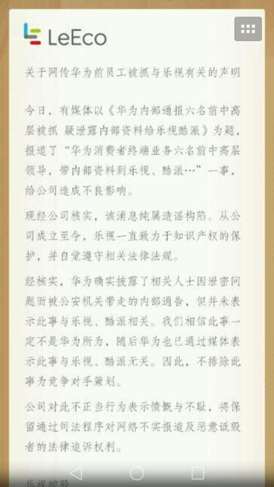 华为方面并未对此作出官方回应,但华为终端部门对第一财经记者表示,通报中的内容并不涉及酷派以及乐视两家公司,并且涉事人员非公司高管,此次事件主要涉及知识产权侵权问题。
