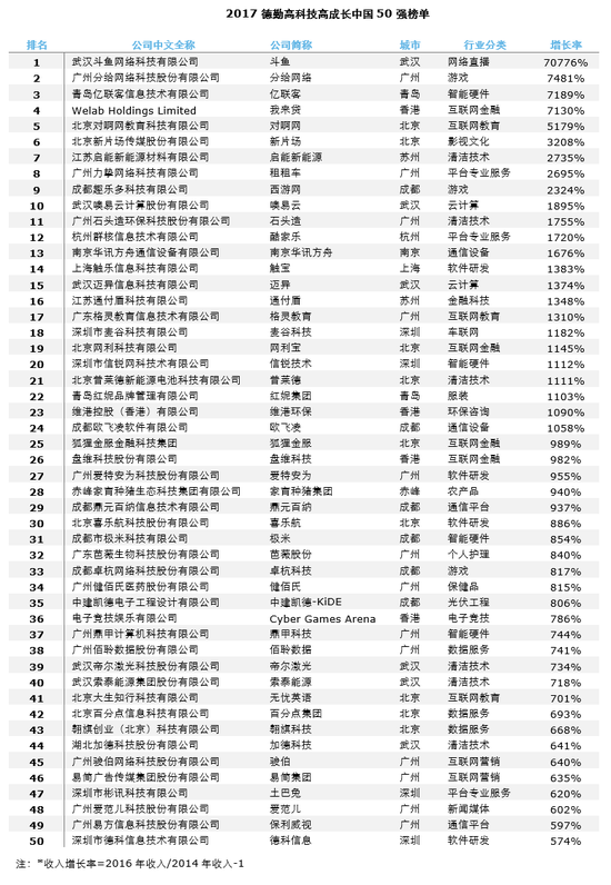 11月9日,德勤在广州召开记者会发布了《2017德勤高科技高成长中国50强报告》(下称中国50强报告)和《2017德勤广州高科技高成长20强报告》(下称广州20强报告)。中国50强报告指出,今年德勤中国50强整体收入增长高达2978%,是历史最高水平, 比2016年增长26.8%。其中,斗鱼以70776%的三年累计增长率为榜单最高,紧跟其后的分给网络和亿联客三年累计增速分别为7481%和7189%。