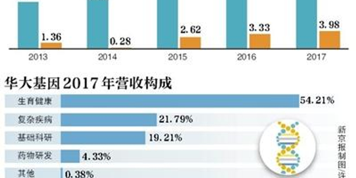 2017年,华大基因“生育健康类”业务营收共11.36亿元,同比增长22.28%,占当年的华大基因总营收比重54.21%,是最主要的收入来源。2014年到2017年,华大基因“生育健康类”业务的毛利率分别为48.54%、69.97%、76.41%和67.77%,是公司主营业务中毛利率最高的项目。