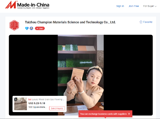 泰州创平材料科技有限公司主营PVC地板和人造草皮,运营经理章女士表示,公司已经参加过中国制造网组织的多次云展会了,此次是第一次尝试在广交会同步活动中“云”参展,公司准备了统一服装及专业的直播设备在展会中进行直播,开展首日,就接到了几单意向订单,达到参展预期。