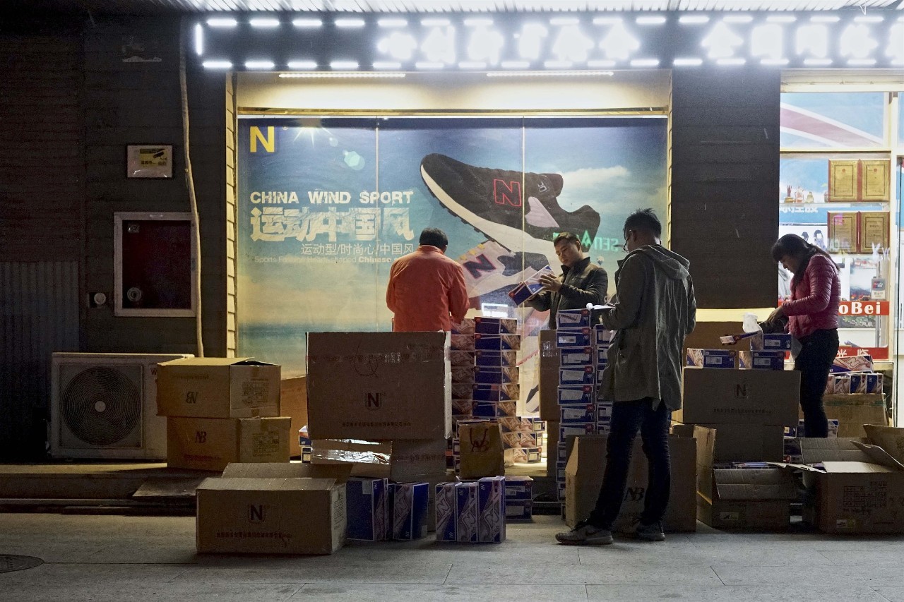 白天,几乎空无一人;傍晚,门店零星开张;入夜,摩托、面包车来来往往,一分钟有时可通过百辆。车上装卸的包装,印着耐克等知名鞋类商标……这便是“鬼市”的常态。