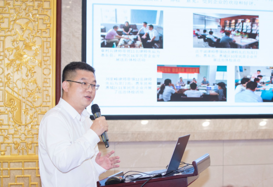 惠州市民营企业律师服务团副团长章利兵就惠州市民营企业律师服务团工作情况进行了汇报。展示了服务团的法治体检、普法及法治论坛、开展企业复工复产法律服务等各项成果,并针对民企服务的不足提出了针对性建议。