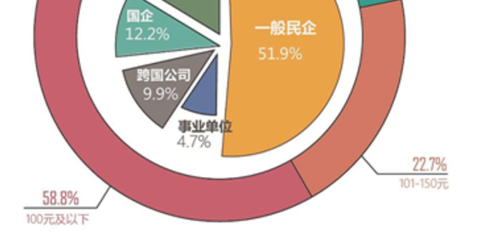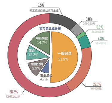 按日薪计算,58.8%的雇主提供实习生的日薪在100元以下,22.7%的学生实习日薪在100~150元之间。66.5%的受访者在民(私)营企业实习,但相对于民(私)营提供了85%以上的就业机会,民(私)营企业提供的实习机会仍属偏少。跨国企业和知名民营企业的日薪水平最高,但提供的实习工作机会分别为13.1%和14.7%,主要集中在一线和杭州、武汉和成都等快速发展的二线城市,实习后留用的机会并不多。事业单位和国有企业的实习薪资较低,且提供的实习机会中无薪酬的比例最高,分别占44.1%和13.5%。