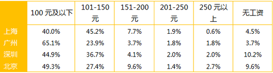 一线城市的实习生日薪的平均水平略高于其他城市。45.2%的学生子在上海的实习日薪在100~150元水平,在各城市中比例最高,而北京的实习日工资在151~200元的人在各城比例中居首,达到9.6%。如果考虑到午餐和上下班的用车等投入,一线城市实际的实习收入更高。以日薪150元计,上海实习生薪资水平相当于毕业后薪资水平的七成。