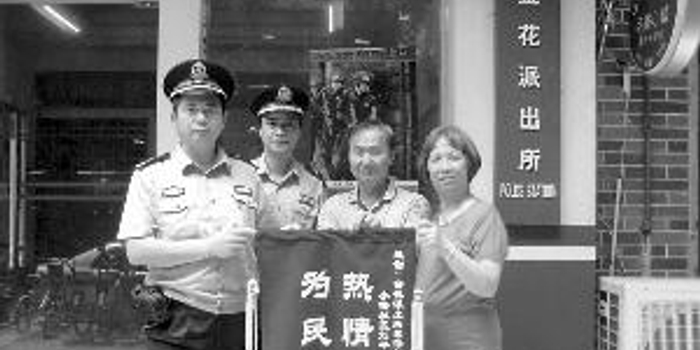 孔叔夫妇将锦旗赠予社区民警刘平(左一)和梁伟林(左二)。受访者供图