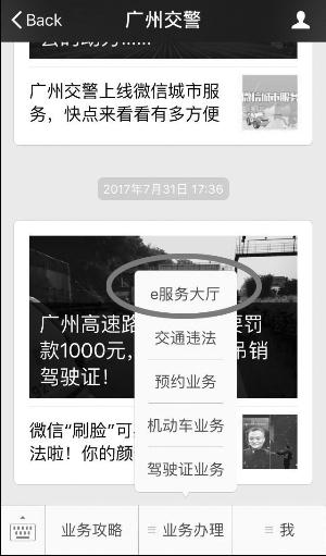 记者体验了一把“违法免分券”的领取过程。首先,需要关注“广州交警”微信公众号,之后,点击“业务办理”选项卡的“e服务大厅”,即可看到“违法免分券”一项。要想领取“免分券”,则要先注册成为广州交警e会员。