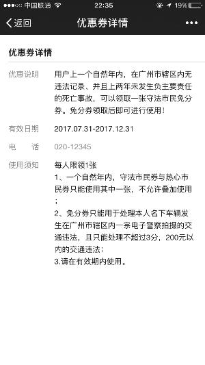 记者发现,领取使用“免分券”后并不能直接用,还需答对10道关于安全文明驾驶的题目激活才能使用。同时,也不能处理所有的违法扣分,记者从“热心市民券”和“守法市民券”上看到,“免分券”可用于处理本人名下粤籍车辆发生在广州市辖区内的一宗电子警察拍摄的不超过3分、200元以内的交通违法。