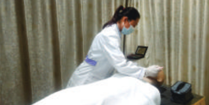 工作人员在人体模型上作遗体化妆演示。/殡仪馆供图