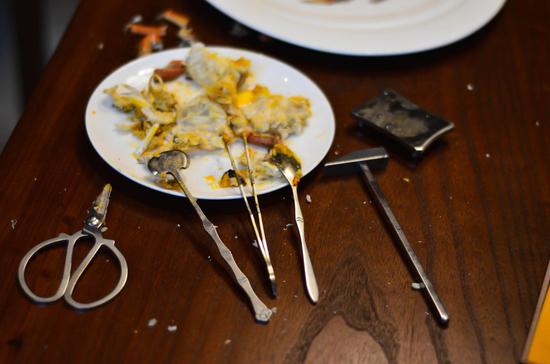匙、锤、镊、镦、剪、叉、斧、刮等八样工具就是一些人口中的蟹八件,它们分别应对食蟹中的不同环节和螃蟹的不同部位。用剪刀将蟹的两只大鳌和八只大脚逐一剪下,再用镊和叉将蟹脚中的肉取出,这些都是为了保持螃蟹的完整性。