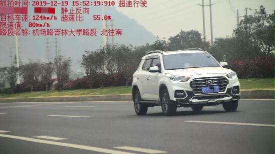 没想到几分钟后,一辆粤C0××F0号白色现代小车沿机场路飞驰。司机胥某要去吉林大学附近借工具来装空调,想到四点半还要回去接小孩放学,一着急,油门越踩越深,结果在吉林大学路段被电子警察抓拍超速,车速达124km/h,而该路段限速80km/h,超速达55%。
