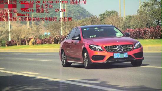 很快,陈警官就看见一辆红色奔驰小车由北往南快速驶来,“嗖”的一声把同行车辆统统抛在身后,红色的身影特别抢眼。一看车牌,正是触发警报的小车,车速达到94km/h,而该路段限速80km/h,超速达17.5%。