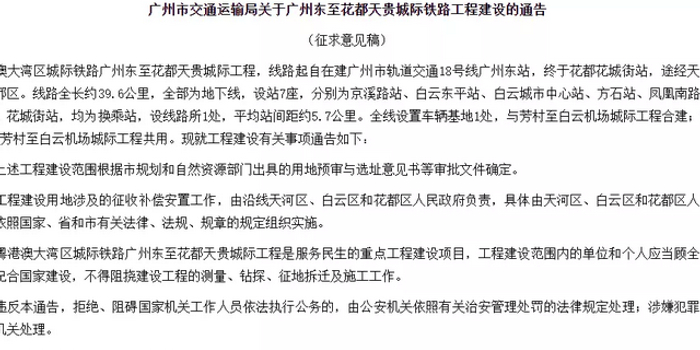 关注羊城晚报全媒体记者严艺文报道:广州市交通运输局日前发布了关于征求对广州东至花都天贵城际铁路工程和芳村至白云机场城际铁路工程建设意见的通告,公布了两条城际铁路的站点,就这两条城际的建设公开征求社会公众意见。公众可于11月30日前反馈意见。