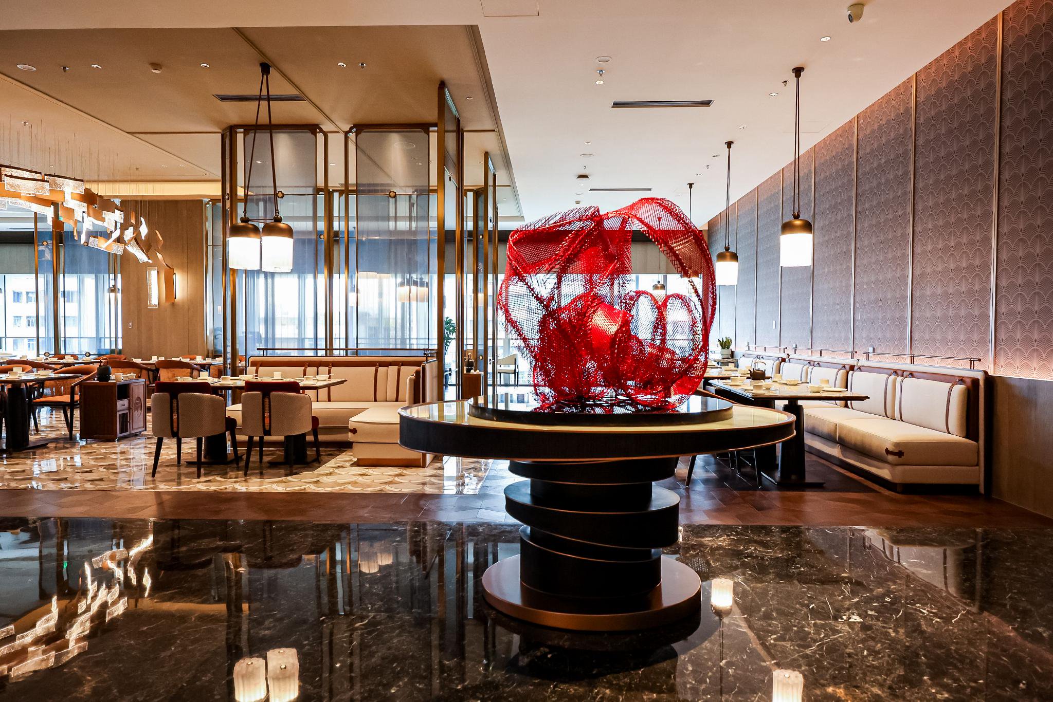 餐饮打造多元特色矩阵。彩丰楼中餐厅,以醉龙彩凤、火焰铁花的鲜活图景为主题,呈现新派粤菜与地道本帮菜。鲜艳全日餐厅,以现代设计融入六坊云龙舞与灯笼制艺,厨师团队将生猛海鲜与本土食材巧妙融合。传承中华面食精髓的麵家,营业至凌晨24点,以匠心汤底与手作面条,温暖每一个深夜。举茗邑则将香山茶文化与沙溪凉茶融入当代生活,于47层云端以茶会友,尽享东方意趣。