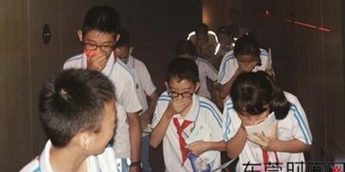 “捂住口鼻,弯腰低头,快速通过!”在撤离时,消防队员不断地告诉同学们“逃生”口诀。在滚滚的“浓烟”、急促的警报、变暗的灯光中,同学们依照“逃生”口诀,一个个鱼贯而出,“顺利”撤离。