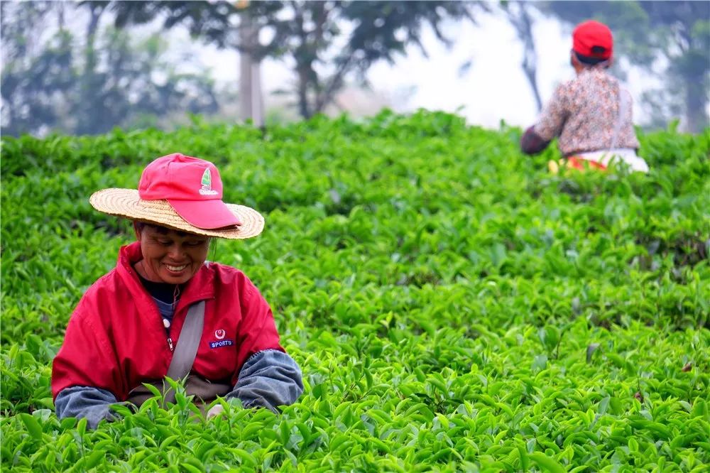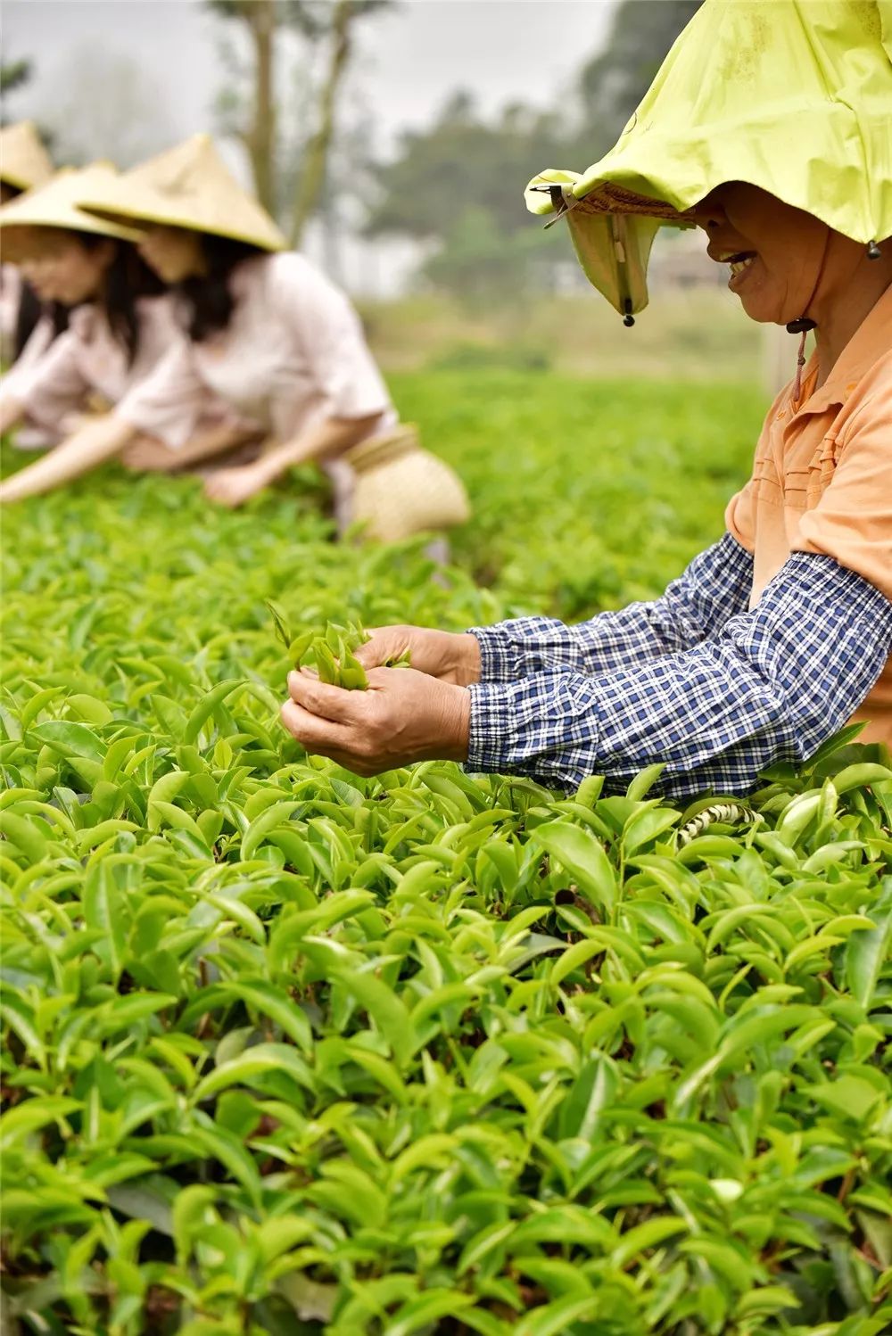 早已到了退休年纪的珍姨,在采茶的旺季时,还是愿意到茶场里走走,帮忙采摘茶叶。技术熟练的珍姨只采摘茶树芽头及下面两片嫩叶,即一芽两叶,她手指异常灵活,抓住茶树新梢顶端,快速折下嫩芽和芽头下面两片叶子,攒成一把抛到身旁的箩筐里。