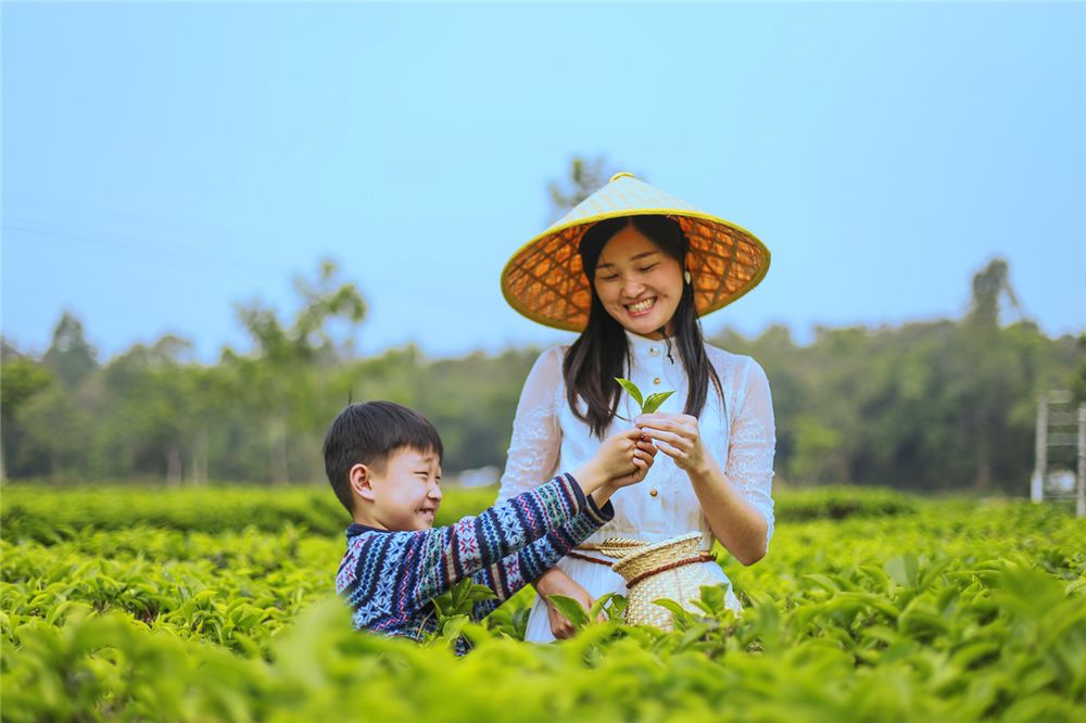 有家长和小朋友头戴斗笠,背挂竹篓,跟随茶农行走在茶场中。只见茶农眼神专注,巧手翻飞,抓准茶叶新生嫩芽并迅速摘下。大家感叹茶农手法熟练之余,更是认真地学着采茶。