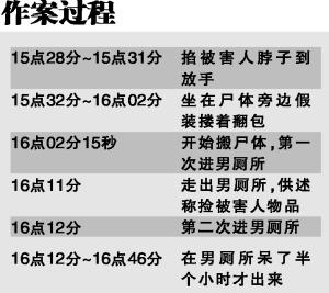 抱了几分钟,再翻开被害人的背包,找到一些物品。然后,唐灼龙将尸体扛到男厕所,先把尸体放在厕所门口,然后回到凳子把银行卡等物品拿走,把背包、水壶、雨伞、眼镜等扔到草丛和垃圾桶,再回到厕所把尸体拖到角落。唐灼龙说,整个过程中,他没有与被害人说过一句话。