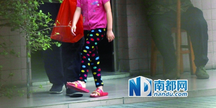 21日,吃过早饭后,王建国(左)带着女儿(中)在佛山市救助站生活区内溜达。老丈人徐某拄着拐杖坐在一旁发呆。