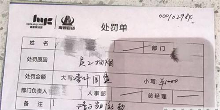 从周小姐提供的处罚单上,记者看到,手写的处罚单编号,处罚原因是 " 员工抽烟 ",没有公章,只有部门负责人的签名,以及在备注栏写着 " 请于当日缴款 "。对此处罚单,周小姐不禁十分不解," 依据《深圳经济特区控制吸烟条例》,处罚不应该达到 1000 元,而且商场是否有权利对公共场合抽烟做出处罚呢?同时,商场给出的处罚单也不是正规的。" 周小姐说