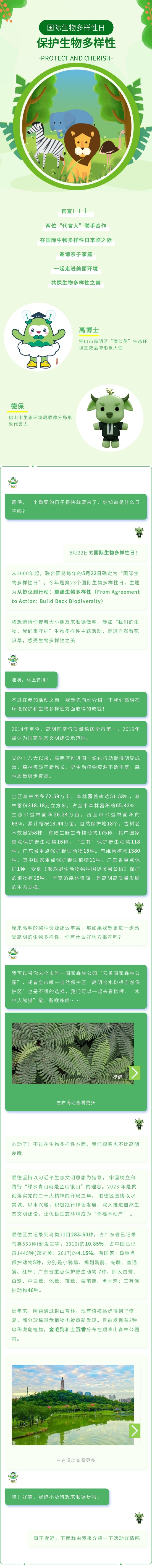 5月20日,顺德、高明两位“代言人”联手合作,在国际生物多样性日来临之际,邀请亲子家庭,一起走进美丽环境,共探生物多样性之美!尊重自然、顺应自然、保护自然,让孩子上一堂“自然课堂”,学习保护生物多样性!