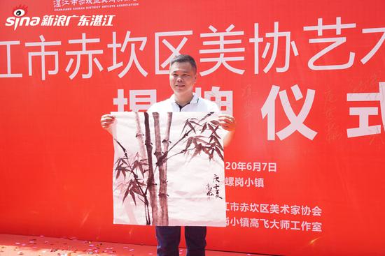 仪式上,随着冯兆平先生、高飞先生、谭启滔先生、杨其军先生、庄燕梅女士和罗伟军先生将红色绸缎缓缓揭开,湛江市赤坎区美协艺术创作基地宣告正式成立。湛江市文化馆创作部主任卓大院长向高飞赠送一枚其亲手雕刻的印章,上面刻着“高飞之印”。杨其军先生为代表赠送高飞先生中国书法家协会会员、广东省书法评论家协会副秘书长郭亚明的墨宝——“饮和食德”。