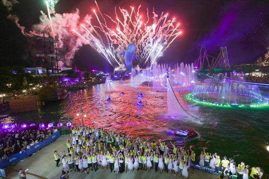 夜幕降临,近百对新人漫步到海洋王国观赏全新夜场大型汇演“海洋保卫战”,伴随着激情的音响,炽热如爱情的火焰,满天点缀的无人机超大表演阵列和惊险的水上飞人表演,在璀璨烟花天幕下,准新郎和新娘十指紧扣许下一生的诺言。