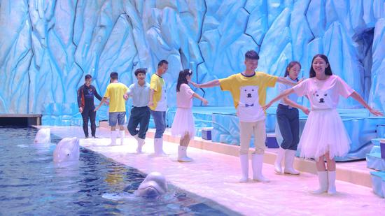 更有新郎新郎来到白鲸馆邀白鲸一起跳起华尔兹,握手互动,共同亲吻这萌化的海洋精灵。而浪漫的新郎则挽手身穿婚纱的新娘踏进白雪皑皑的企鹅馆,围绕在帝企鹅宝宝孵化区,惊叹南极新生命诞生的神奇。
