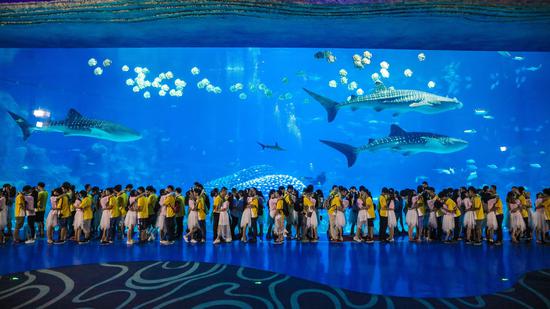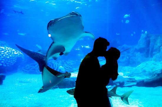 这一场别来生面的海洋集体婚礼才刚刚开始!7月9号,新人一起走进鲸鲨馆与多条鲸鲨共舞,收获成千上万珍稀海洋动物的簇拥祝福;幸运的新人甚至深潜到海豚岛海底,尽情地追逐海豚畅游,体验“爱比海更深”的悸动,定格珍贵的留影。