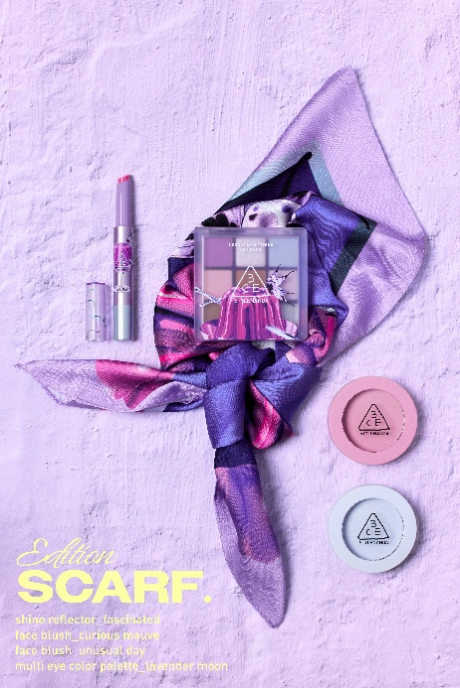 系列涵盖3CE人气单品 — 九宫格眼影与融光唇冻等,并注入Ram Han标志性的艺术笔触。其中,“丝巾限定”系列的一大亮点,当属水粉蓝单色腮红,一抹既能高光闪耀,亦能晕染成柔美腮红,轻松解锁多元妆容体验。