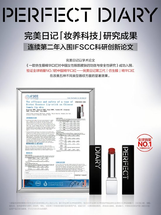 2025年,完美日记重磅亮相第35届IFSCC大会(国际化妆品化学家联合会大会,被誉为“化妆品界诺贝尔奖”),携第三代妆养仿生膜科技Biotec™与首创 ‘妆养仿生膜™’明星套装亮相这一全球化妆品最高学术舞台。品牌科研成果连续第二年入围IFSCC科研创新论文,并展示了全球销量NO.1的中国精华口红——第三代‘仿生膜’精华口红在改善五种不同类型唇纹上的显著效果;IFSCC主席Vania Leite亲临完美日记展位,与团队探讨如何集结全球科研力量共研仿生膜科技。