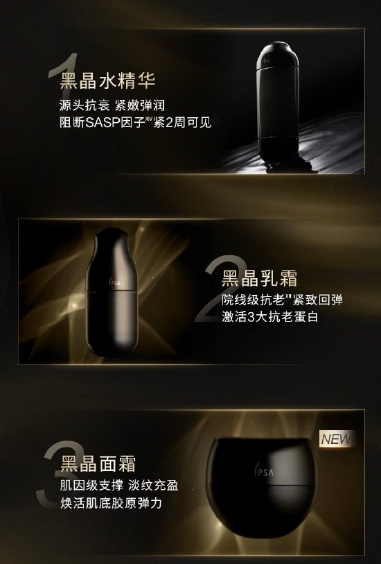 IPSA茵芙莎高能“黑晶家族”为熟龄肌构建多链路抗老矩阵,带来高阶奢宠体验。