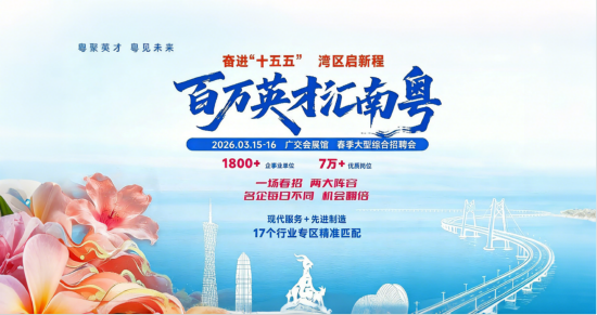 3月15日至16日,2026“百万英才汇南粤”春季大型招聘会将在广交会展馆D区17号馆举行,全省超1800家优质单位将释放超7万个优质岗位。在17.1馆(现代服务馆)和17.2馆(先进制造馆),南沙将设立专属招聘专区,携带100家辖区内的名企优岗集体亮相,还将为投递简历的人才送上2026粤港澳大湾区灯会福利。