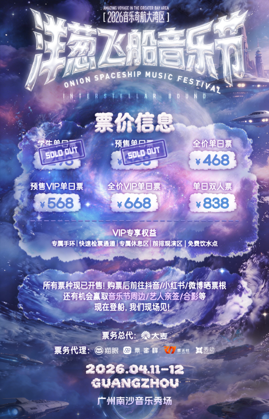 更多票务平台请搜索猫眼/票蜜蜂(抖音搜索)/票无忧,现已开票!详情规则关注各平台官方账号@洋葱飞船音乐节。