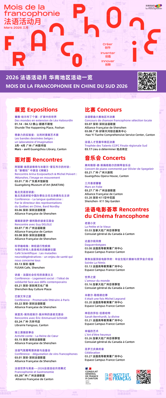 2026年法语活动月由中国法国文化中心统筹协调,并与多国使馆及文化机构合作举办,呈现一系列丰富而开放的活动内容,展现面向未来的法语世界:围绕法语创新特色的讲座与圆桌讨论,以及电影、音乐、现场演出、比赛、工作坊等精彩活动……不管你会不会说法语,都可以前来探索用法语创作、创造、创新的无限可能!