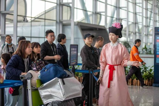 T2、T3航站楼的汉服执勤,刷频各大平台热搜榜。T2航站楼的“宋服卫士”身着宋代形制服饰,以优雅的叉手礼致意,用“客官,这边请”的古风问候做引导,让严肃的安保环节多了一份温柔与庄重,不少外国旅客主动上前合影,感受中华传统文化的魅力。T3航站楼防爆检查工作人员身着唐装,圆领袍衫配织锦纹样,襦裙搭飘逸披帛,广袖轻拂间尽显风雅。他们以专业守护安全,用东方礼韵传递温暖。“一进航站楼就被惊艳到!安检小姐姐的汉服配牡丹簪花,行礼的瞬间感觉穿越了!” “这种松弛感让匆匆出行的旅客一下子轻松起来”……评论区里满是来自各地旅客的真情流露,每一条都藏着对白云机场这份文化惊喜的认可。