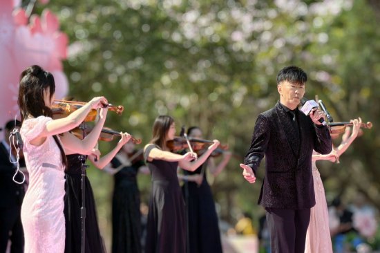 著名歌手李达成携手乐团倾情演绎《月半小夜曲》《凭着爱》等经典曲目,弦乐声与歌声交织,余韵悠长。“在樱花树下听小提琴合奏,还有熟悉的粤语歌,氛围感拉满了!”现场游客纷纷举起手机记录。