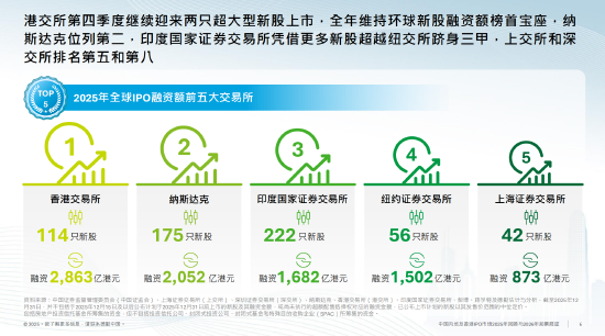 受惠于8只超大型新股上市,当中4只项目位列2025年全球十大新股之列,香港交易所将以2025年新股融资总额位居榜首。而上海证券交易所(上交所)在全球排名第五,深圳证券交易所(深交所)则排名第八。