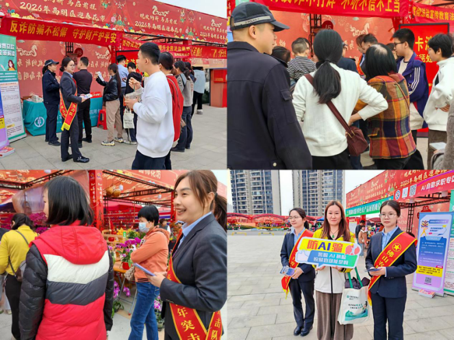 活动现场人流如织,有老年人,也有正值寒假的学生和青中年市民。摊位设立宣传展板、悬挂警示横幅,向过往群众普及各类诈骗手法及防范技巧;反诈民警结合真实案例,深入浅出地剖析电信诈骗、网络刷单、征信骗局等常见套路,反复提醒市民:陌生来电不轻信、不明链接不点击、转账汇款多核实,守好自己的“钱袋子”;工作人员手持小巧提示板,穿梭于人群中发放宣传折页,用通俗语言传递防骗要点,讲解银行卡安全使用、电子支付风险防范等知识,并现场赠送购物袋、小扇子、日历本等。面对市民提出的各类金融疑问,工作人员一一细致解答,切实提升群众风险防范意识。