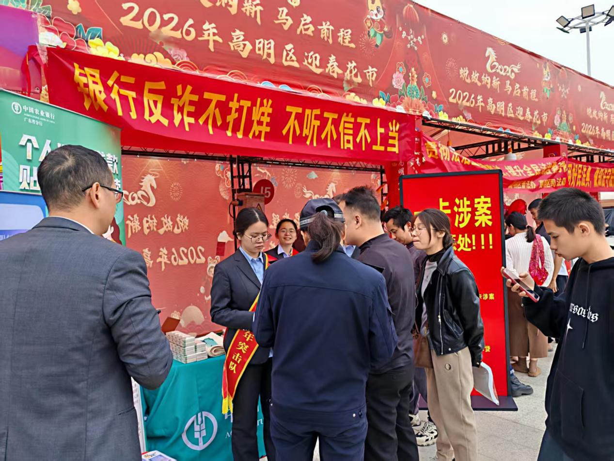 新春佳节将至,为守护群众“钱袋子”、筑牢节日安全防线,农行佛山高明支行携手高明区反诈中心、区金监局,2月12日在高明区苏村迎春花市开展反诈宣传主题活动。高明区反诈中心、区金监局及支行个人金融部、综合管理部相关领导及工作人员现场参与本次宣教活动。
